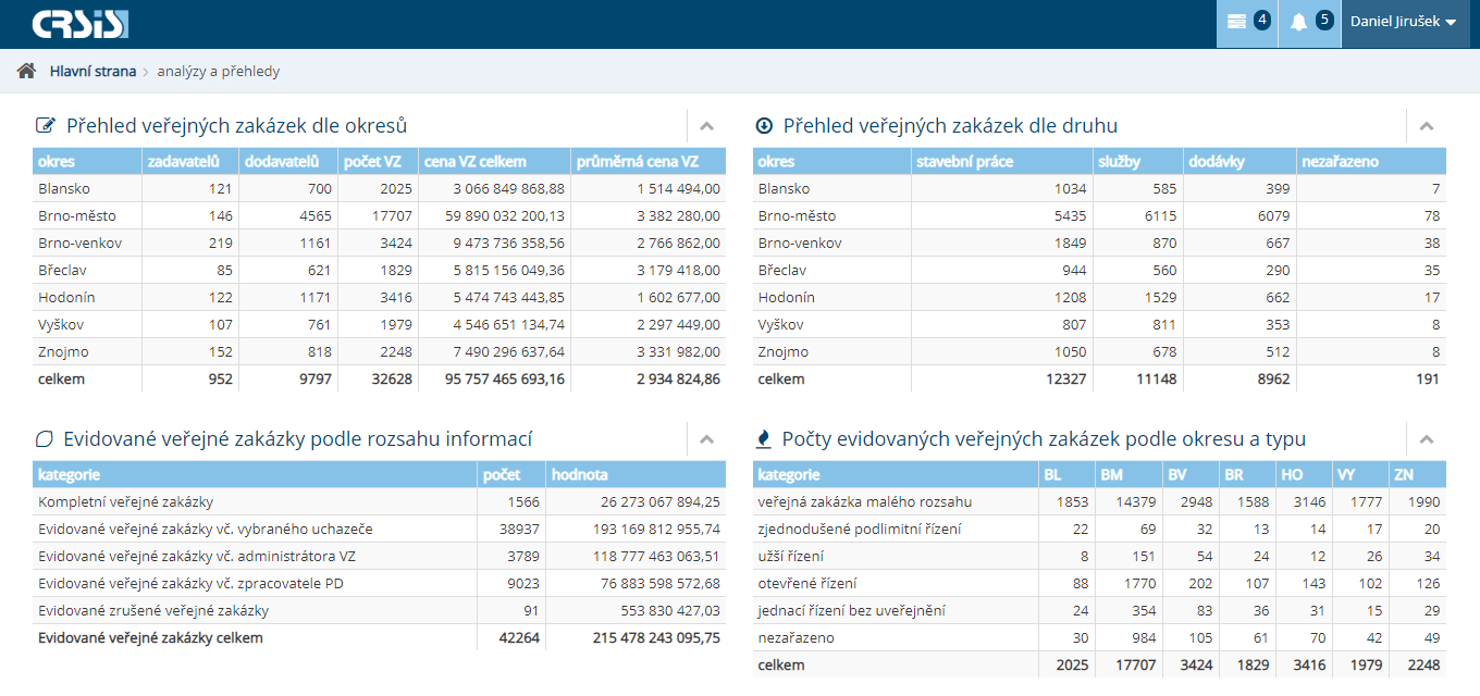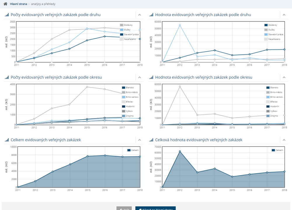 Analýzy veškerých veřejně dostupných informací obsahující přehledy realizovaných veřejných zakázek podle okresů, předmětu, typu, hodnot a počtů VZ